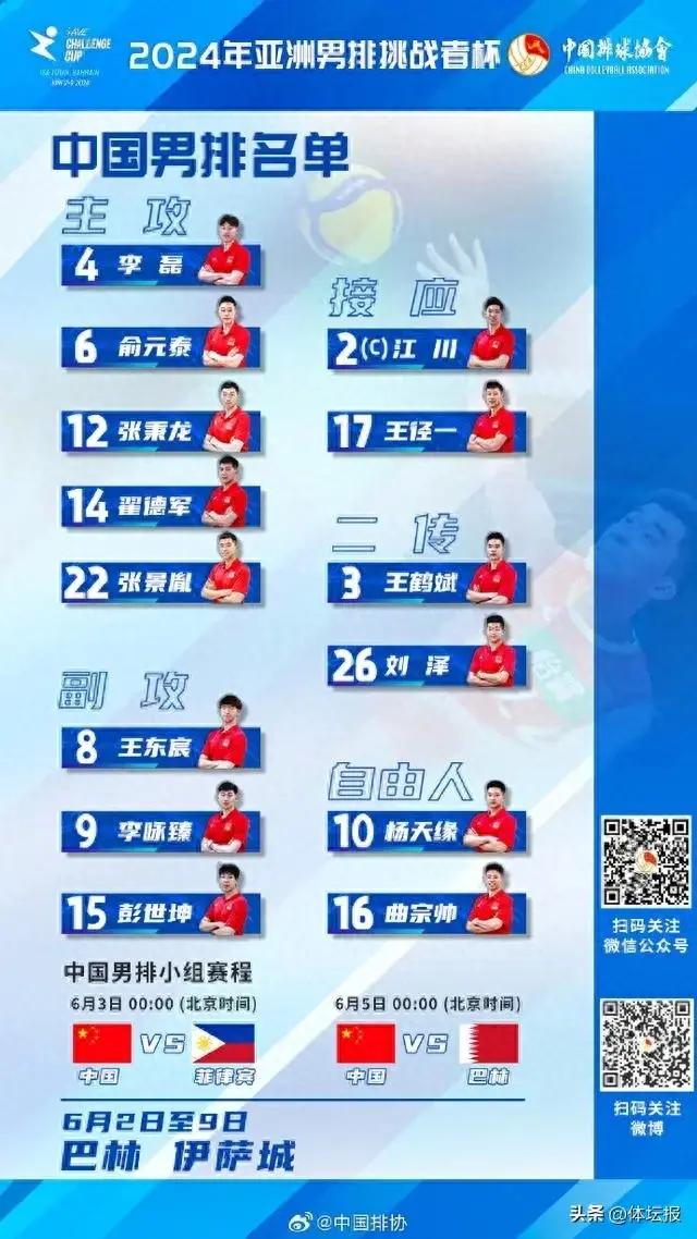 亞洲挑戰者杯|中國男排公佈14人名單,張景胤、江川領銜,李詠臻在列