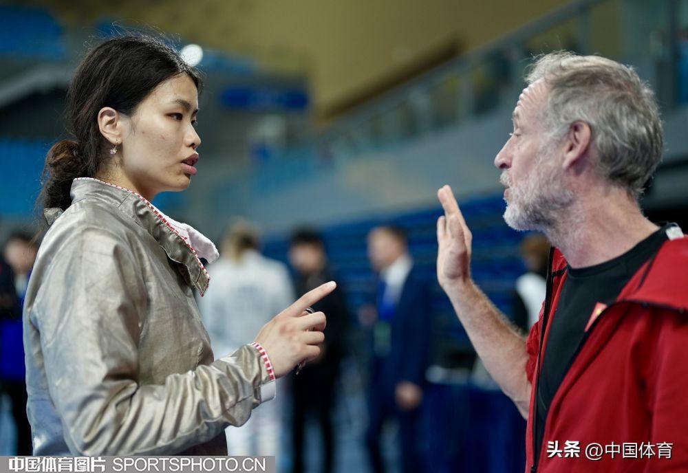 楊恆鬱(左)和中國佩劍隊教練弗雷德裏克•貝拉克交流戰術