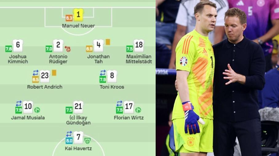 不得不說,諾伊爾整場比賽,連鏡頭也沒幾個,頗爲落寞,在全世界的注視下,光明正大地摸魚,但諾伊爾也有苦衷,不是不想發力,而是確實沒機會出汗,不過他的登場也造就了一個歐洲盃歷史瞬間,那就是第一次教練比隊員年輕,衆所周知,德國隊少帥納格爾斯曼只有36歲,而諾伊爾已經38歲了。