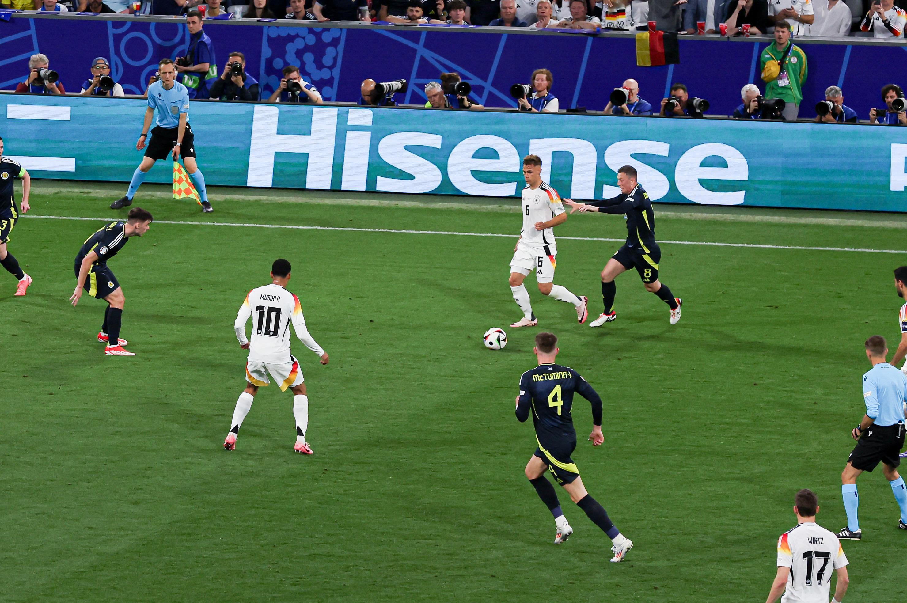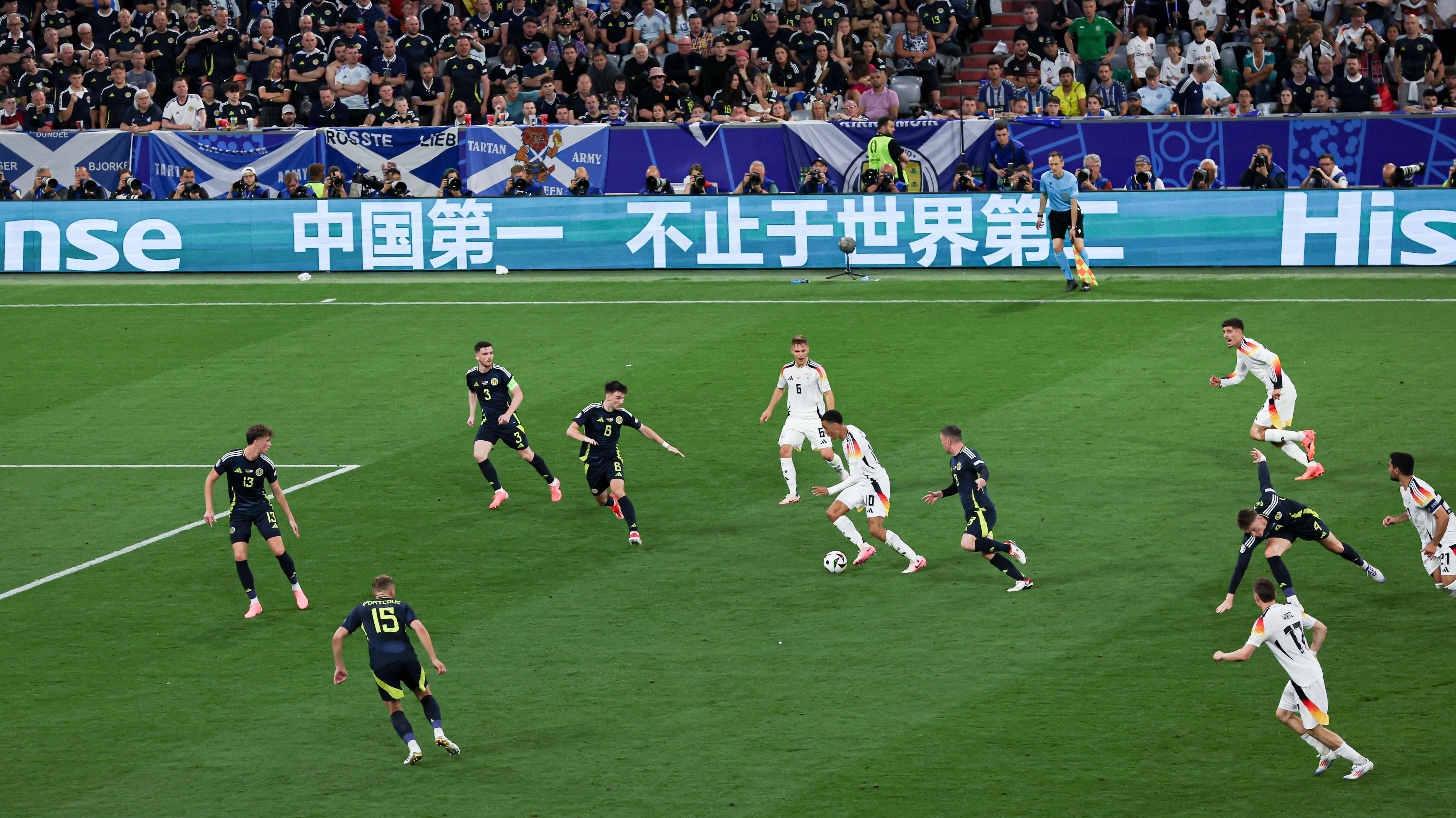 簡單回顧下這場揭幕戰的精彩時刻,上半場比賽維爾茨先拔頭籌,打進本屆歐洲盃的首粒進球,隨後穆西亞拉、哈弗茨擴大比分,蘇格蘭球員波蒂厄斯紅牌罰下,球隊落後還少打一人,極其被動。