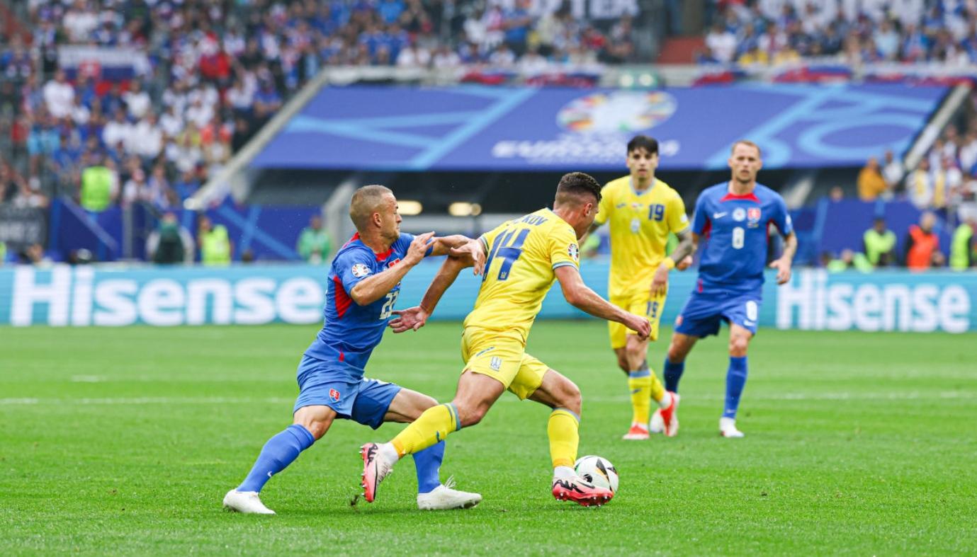而上半場率先打破僵局的,依然是斯洛伐克,比賽第17分鐘,烏克蘭後場出現失誤,哈拉斯林底線處傳中,津琴科冒頂,施蘭茨抓住機會,在遠門柱完成頭球入網,斯洛伐克1領先0烏克蘭,施蘭茨也連續2場比賽完成破門。