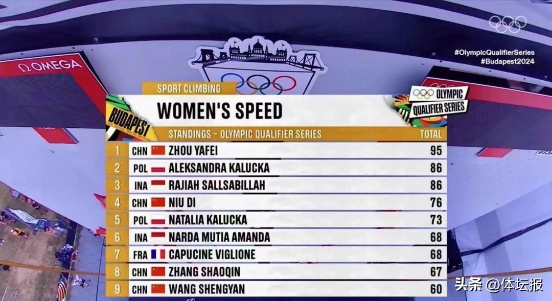 女子組競爭同樣激烈,共有四名中國選手晉級16強。來自浙江的周婭菲闖進決賽,並以6秒52的成績獲得亞軍。(往期報道:浙江姑娘周婭菲絲滑奪冠!網友:看了無數遍,實在是快)加上在上海站奪冠的成績,兩站一共拿到95個積分,總排名第一,周婭菲拿到巴黎奧運會門票。此前,鄧麗娟已獲得奧運資格,中國隊在該項目上實現滿額參賽。