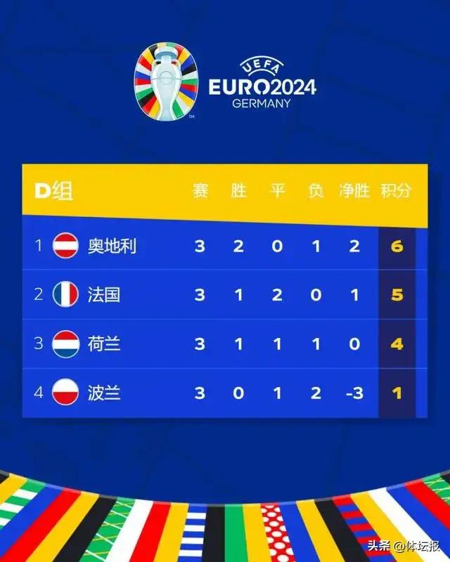 最終奧地利3:2戰勝荷蘭,以小組頭名晉級淘汰賽,法國從此被擠到了上半區。