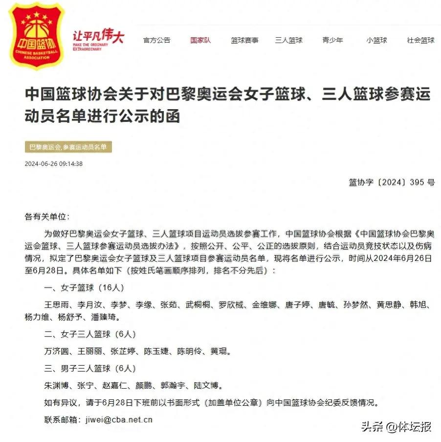 6月26日上午,中國籃球協會官網公示巴黎奧運會女子籃球及三人籃球項目參賽運動員名單 。