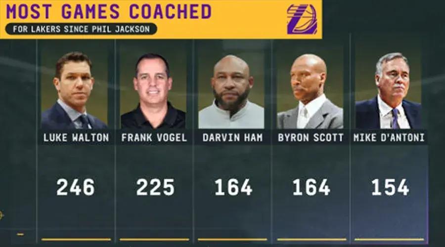 菲爾·傑克遜的確沒讓人失望,兩度執掌湖人,帶領球隊拿下5座總冠軍獎盃,讓湖人隊在21世紀步上了一座又一座新的高峯。但自從菲爾離任後,湖人的教練崗位就再三更迭,再沒有人能執教湖人三年以上,帶領球隊出戰常規賽最多的教練竟赫然是盧克·沃頓。甚至於帶隊拿下2020年園區冠軍的弗蘭克·沃格爾,也沒能在湖人待到三年以上。