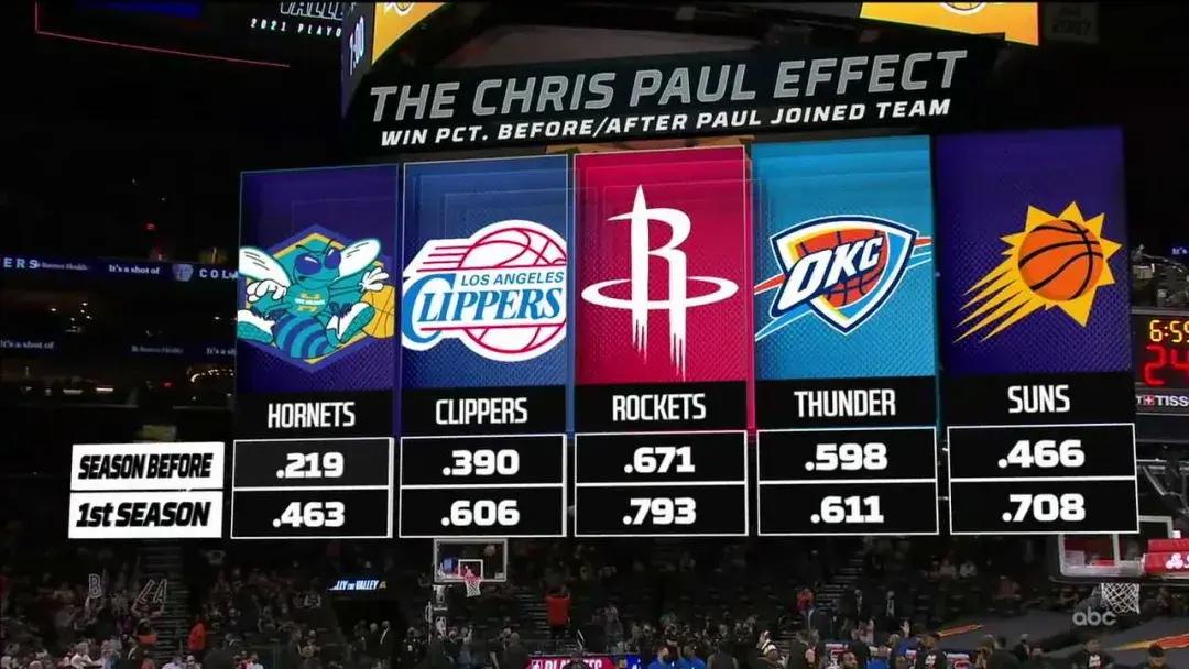 在NBA世界裏,如果不是爲了玩梗,與這位傳奇控衛關係最密切的數字應該是“保羅效應”,即一支NBA球隊在得到克里斯·保羅後總會在勝率上呈現上升,該球隊此前的勝率越低,那麼上升效果往往也就越明顯——這一點在保羅過去效力的每一支球隊,黃蜂、快船、火箭、雷霆、太陽乃至2023-24賽季的勇士都得以體現。