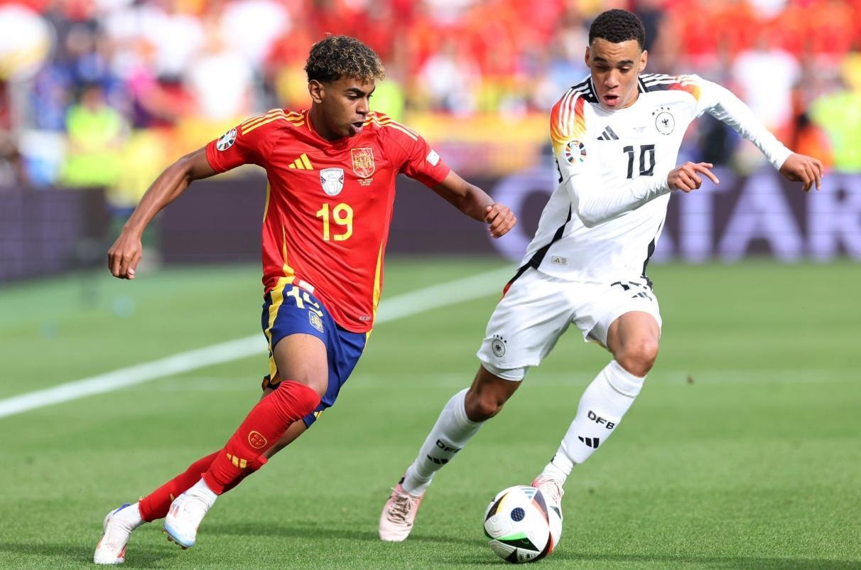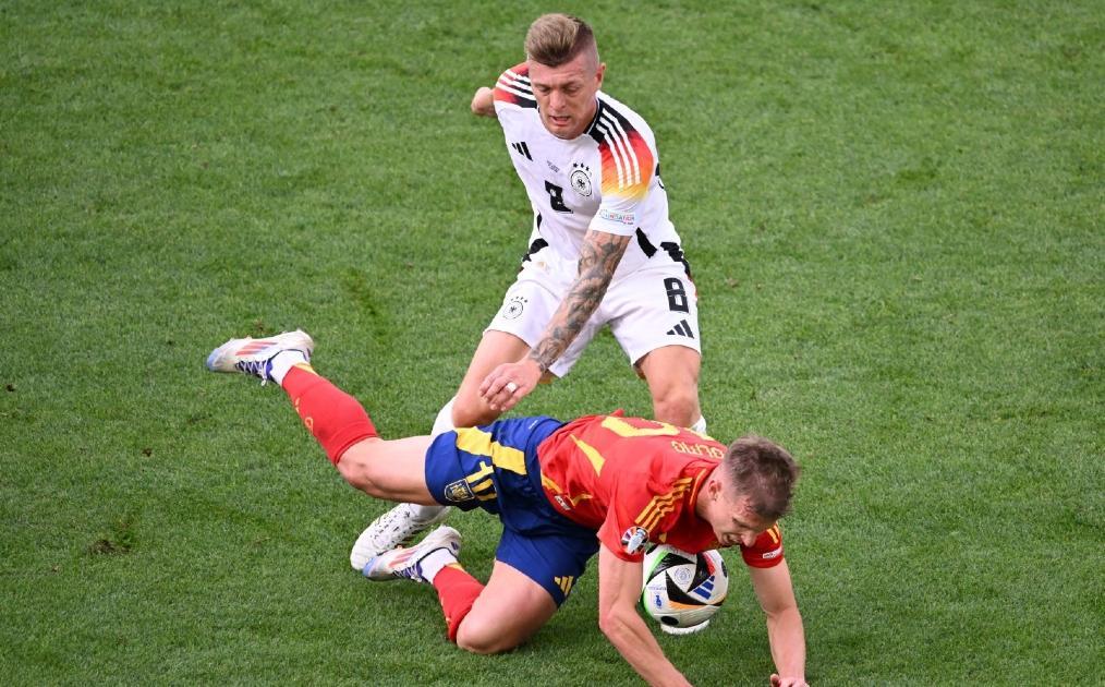 回到這場比賽,前45分鐘雙方均無建樹,開場後不久,克羅斯兇狠放倒佩德里,後者痛苦倒地,之後再次被犯規,無法堅持被換下,奧爾莫替補登場。第15分鐘,亞馬爾主罰任意球,差一點就進了,德國隊逃過一劫。隨後德國隊組織進攻,基米希右路傳中,哈弗茨頭球攻門,被西蒙穩穩抱住,半場尾聲階段,奧爾莫轟出一腳遠射,諾伊爾脫手,跟上的莫拉塔越位了。