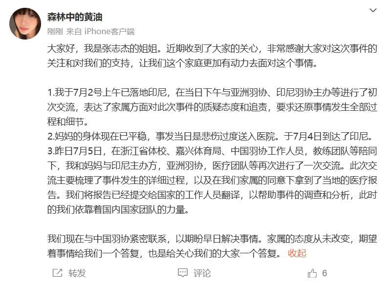 張志傑姐姐透露,她已經與亞洲羽協、印尼羽協主辦等進行了初次交流,表達了家屬的質疑態度和追責要求,並且需要得到張志傑意外去世的全部過程與細節。