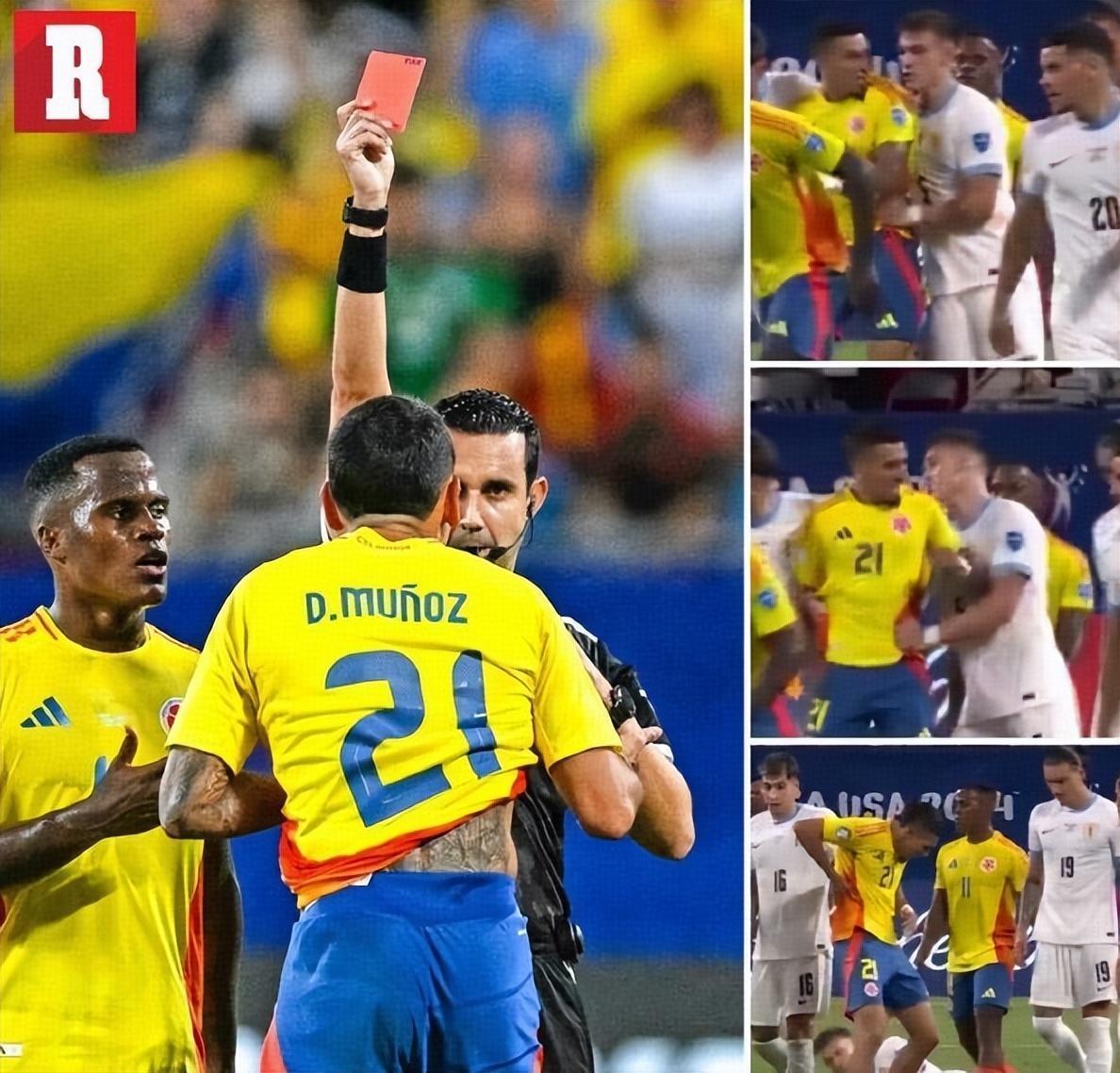 不過在上半場補時階段,哥倫比亞遭遇重擊,穆尼奧斯肘擊烏加特被出示黃牌,從而兩黃一紅被罰下,這意味着,在下半場的45分鐘時間裏,領先的哥倫比亞需要少打一人,可以想見,烏拉圭一定會發起潮水般的攻勢。