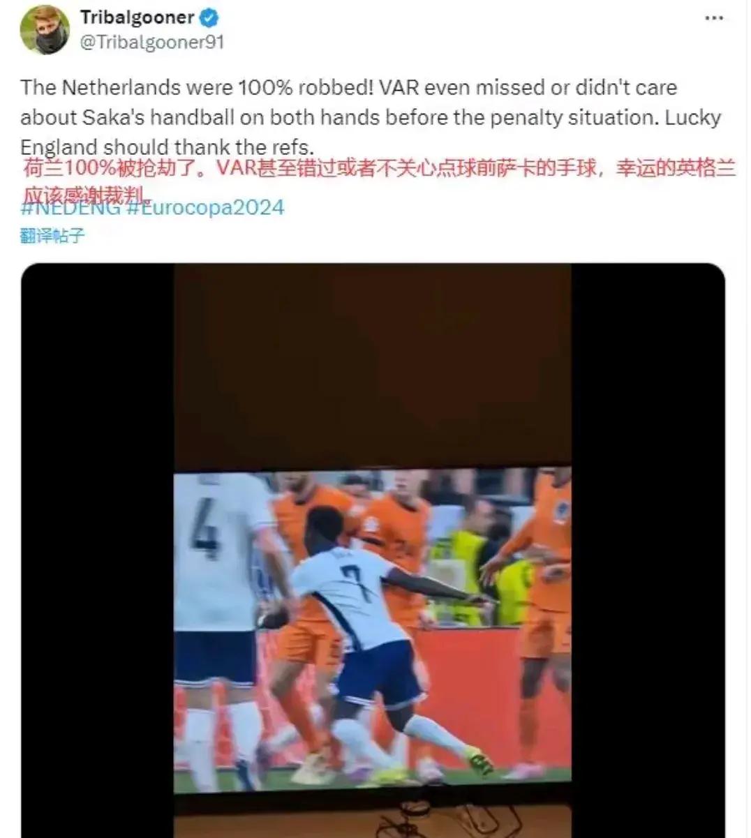 而且不少球迷認爲,最後幾分鐘主裁的判罰也有明顯偏向英格蘭的意圖,荷蘭隊的任意球機會,結果裁判直接判了門球,範戴克作爲隊長說明情況卻被直接掏牌,也能理解他賽後如此憤怒了。