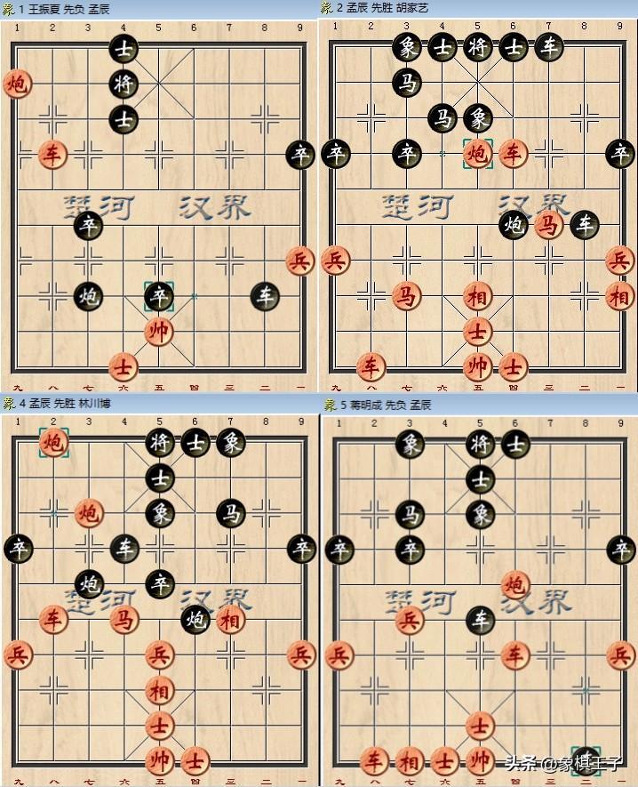 第四輪執先對上前十虎驍將林川博,孟辰27回合車雙炮側翼施殺致勝,第五戰後手贏下新生代大師蔣明成,第六場車炮平王禹博車士象全。
