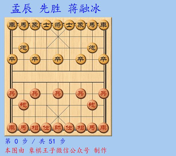 蔣融冰驚出一身冷汗,不能喫馬,只能躍馬出來,紅方提車砍車,黑方進馬踢炮,紅揮車砍士,51手以棄車殺術就地入局。