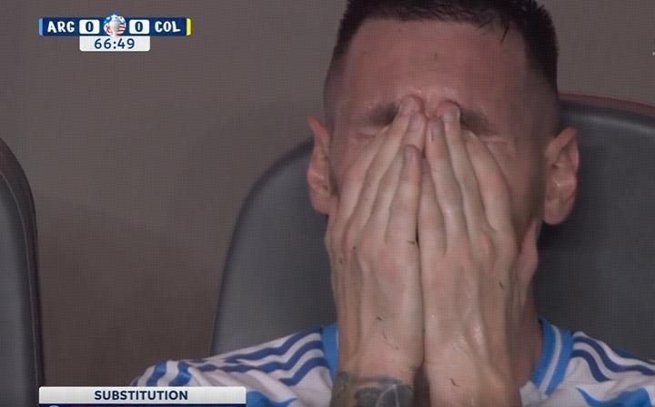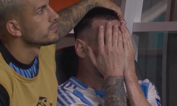 下半場比賽第65分鐘,梅西奔跑中無對抗倒地不起,無法再堅持了,他自己要求示意換人,隨後被岡薩雷斯換下,回到替補席的梅西怒摔球鞋,掩面哭泣,心有不甘!
