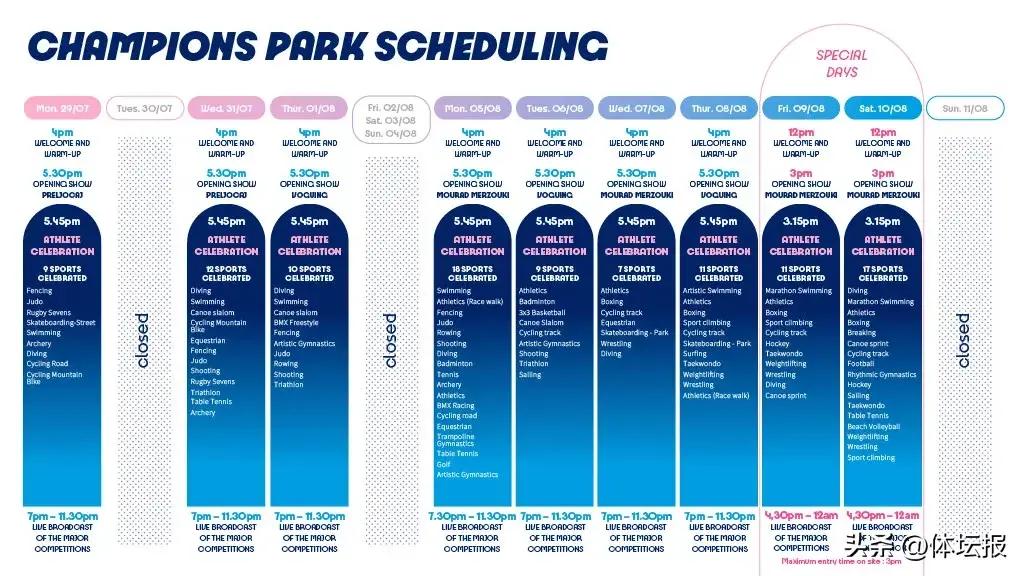 冠軍公園將於當地時間7月29日、7月31日、8月1日、8月5-10日開放,下午有運動員獎牌慶祝活動,晚上現場的大屏幕直播當天的重大體育賽事,這裏還將舉行一系列慶祝表演。