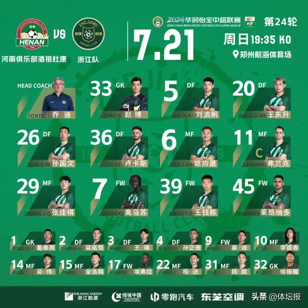 7月21日,中超聯賽進入第24輪比賽的積分爭奪。本輪比賽,浙江做客鄭州,與河南隊展開積分爭奪戰。最終,浙江隊以1-2負於河南隊。