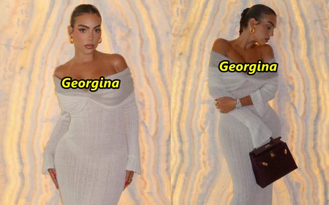 只見,喬治娜穿了一套白色的連體緊身抹胸裙,露出迷人香肩,臀腰比例非常誇張,前凸後翹,從背影看去,簡直跟金卡戴珊沒有區別,事實上,喬治娜無論是身材曲線,還是妝容造型,似乎都有點模仿這位頂級名媛的感覺,很多角度的自拍瞬間,都給人一種金卡戴珊附體的feel。