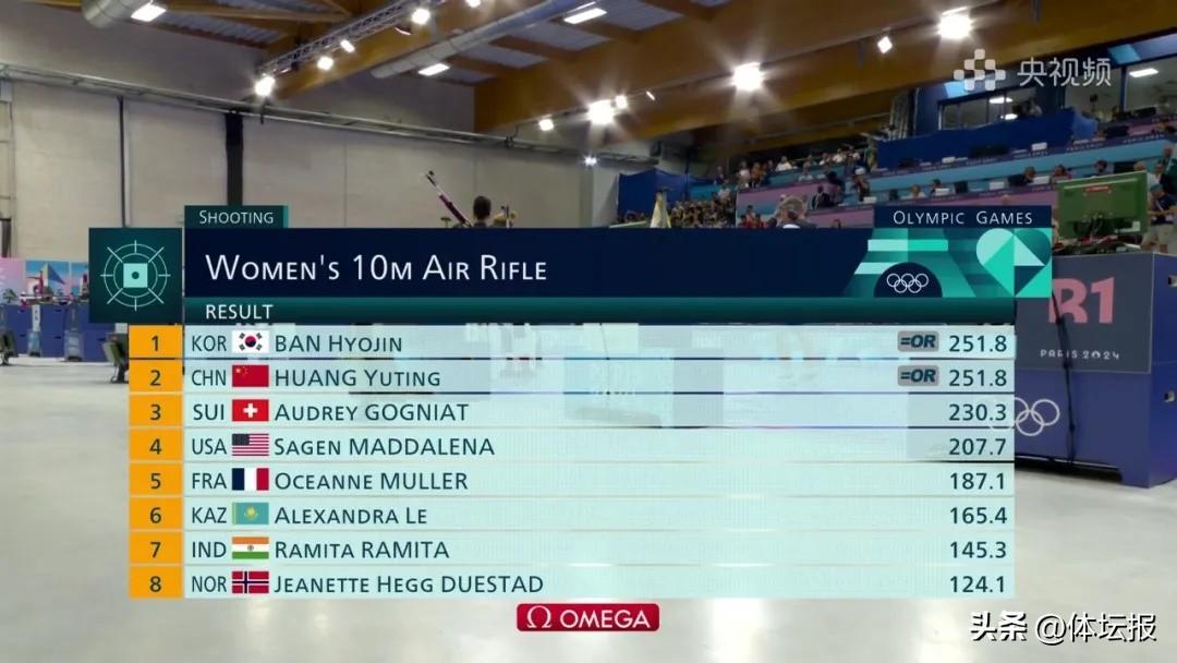 決賽有多緊張?本場參賽年齡最小的16歲韓國選手潘孝珍和黃雨婷一直咬到了最後,兩人都打出了251.8環,追平了奧運會紀錄。最後一輪加搶,潘孝珍打出了10.4環領先黃雨婷0.1環,最終拿下冠軍,黃雨婷屈居亞軍。