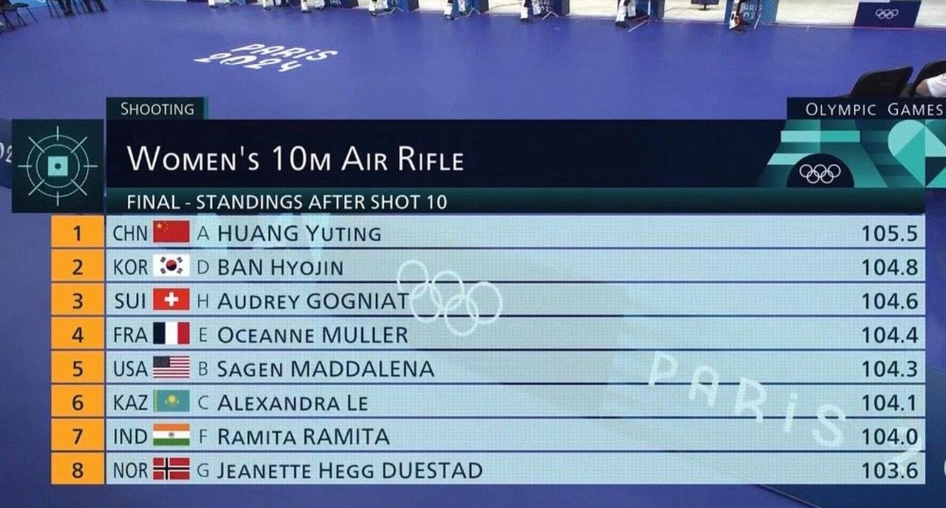 接下來進入殘酷的末尾淘汰制,第一槍,黃雨婷打出10.2環,有點不太理想,但考慮到她之前的成績實在太好了,偶爾起伏一下,也在情理之中,而且黃雨婷及時調整,又是一發10.8環,依舊領跑,身後的韓國選手潘孝真苦苦追趕。