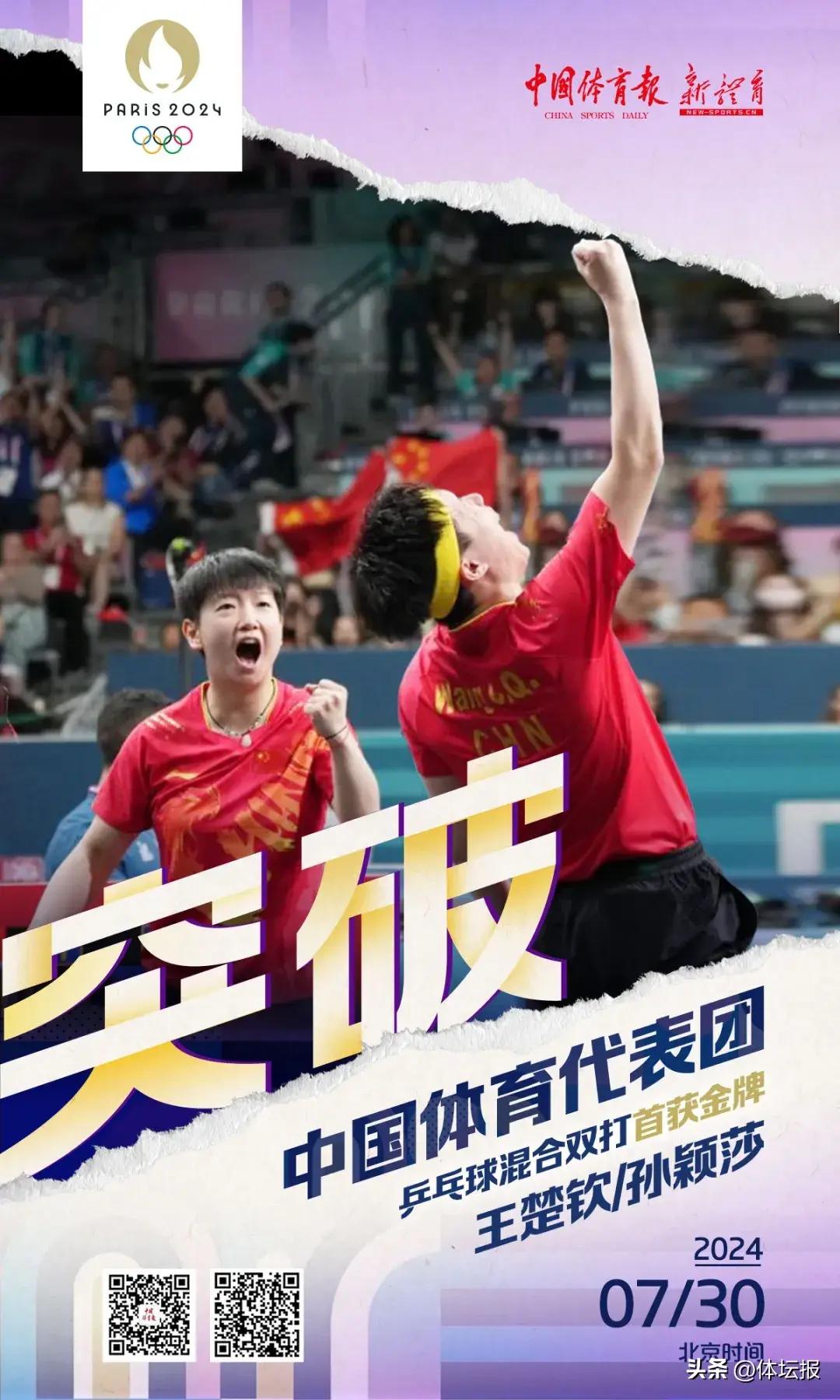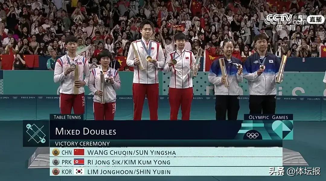 北京時間7月30日晚,在巴黎奧運會乒乓球混合雙打項目決賽中,中國組合王楚欽/孫穎莎戰勝朝鮮組合李正植/金琴英,爲中國體育代表團再添一金,這是巴黎奧運會中國體育代表團收穫的第六枚金牌,也是中國乒乓球隊在本屆奧運會收穫的第一金。