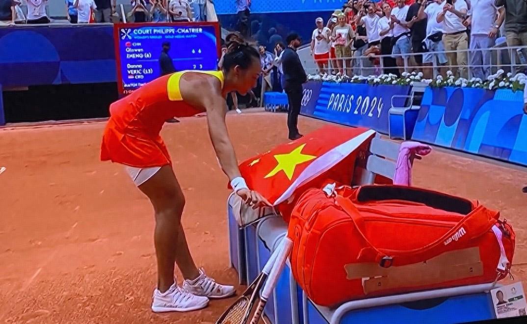 在奪冠之後,還有一個小細節,鄭欽文身披國旗繞場,然後回到自己的球員休息椅上,她小心翼翼地把國旗放平,輕輕地展開披在椅子上,動作非常細緻,並沒有因爲奪冠而情緒失控,面對國旗,她始終保持敬畏感,這纔是優秀運動員的品質。