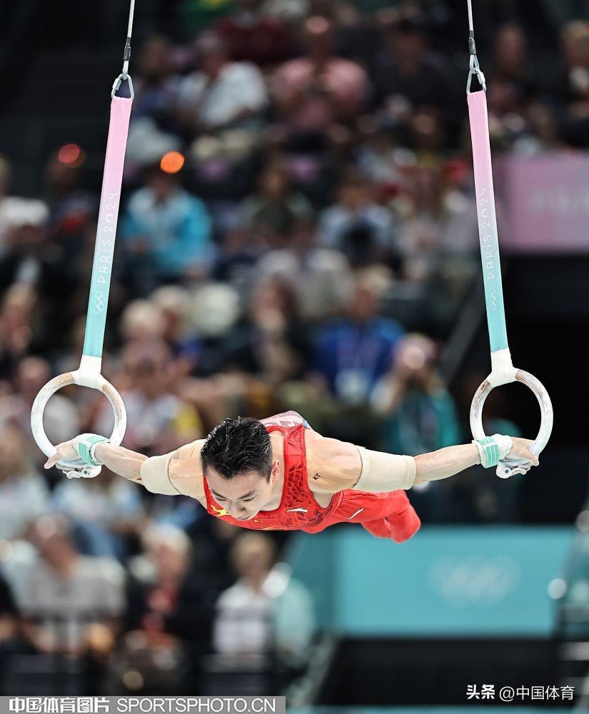 中國體育訊 當地時間8月4日,巴黎奧運會競技體操男子吊環決賽在貝爾西體育館舉行。中國選手劉洋奪得金牌,鄒敬園奪得銀牌。(中國體育圖片 王憲民 攝)