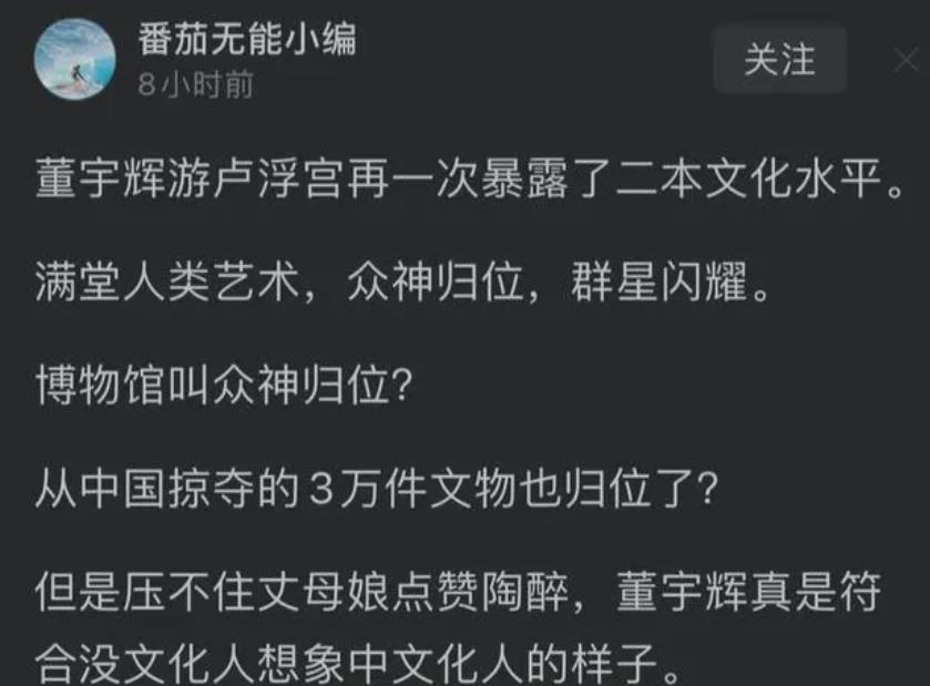 其實,董宇輝去參觀盧浮宮是一件很稀鬆平常的事,作爲一位擁有兩千萬的網絡博主,藉着巴黎奧運會的流量在那裏拍視頻、記錄生活也是在情理之中。但他竟然在參觀完盧浮宮後,發佈這樣的評價:“當我凝視着滿堂的人類藝術,我看到了衆神歸位,羣星閃耀!”