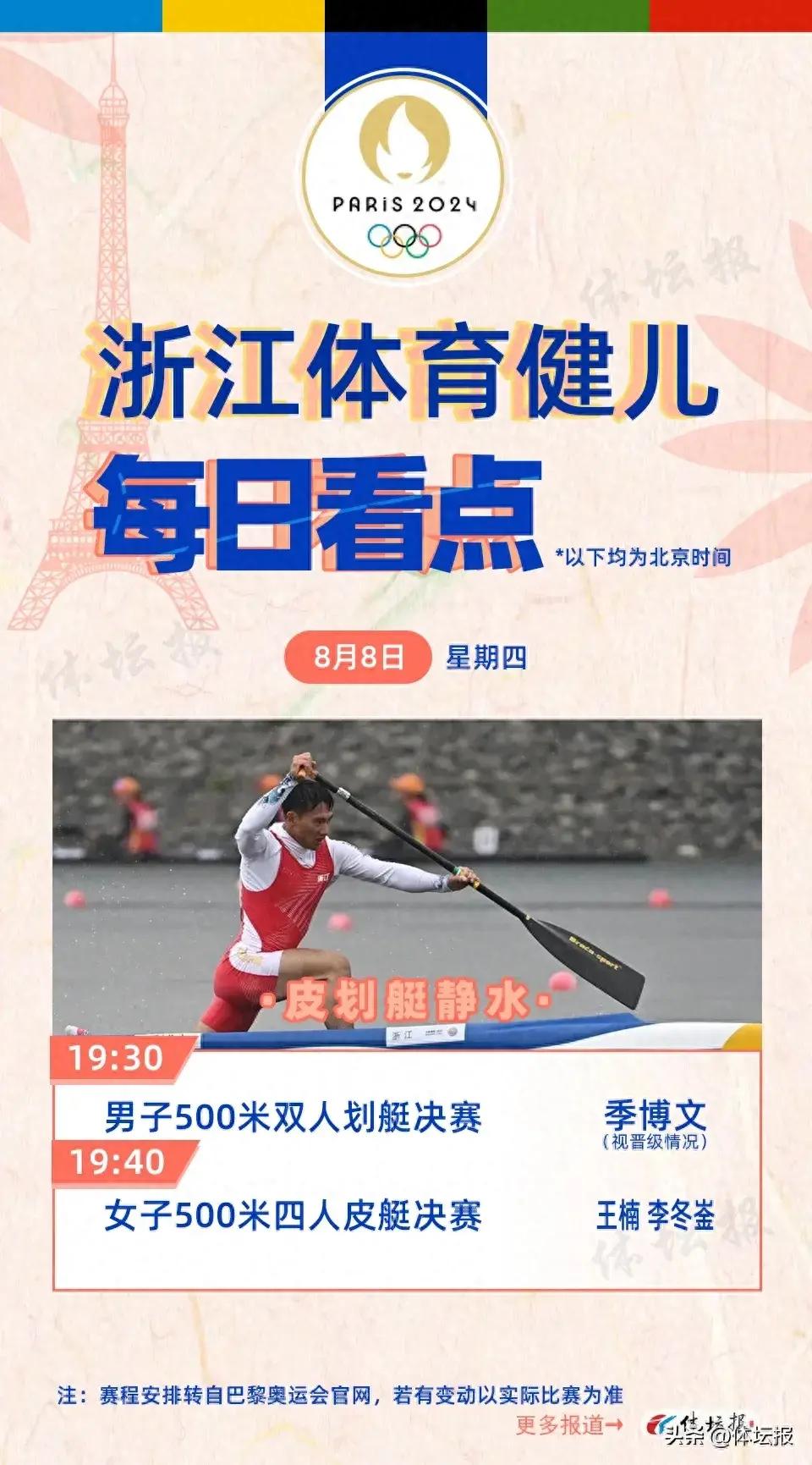 北京時間19:30和19:40,男子500雙人划艇決賽和女子500米四人皮艇決賽將相繼舉行,浙江選手季博文和王楠、李冬崟有望向獎牌發起衝擊。