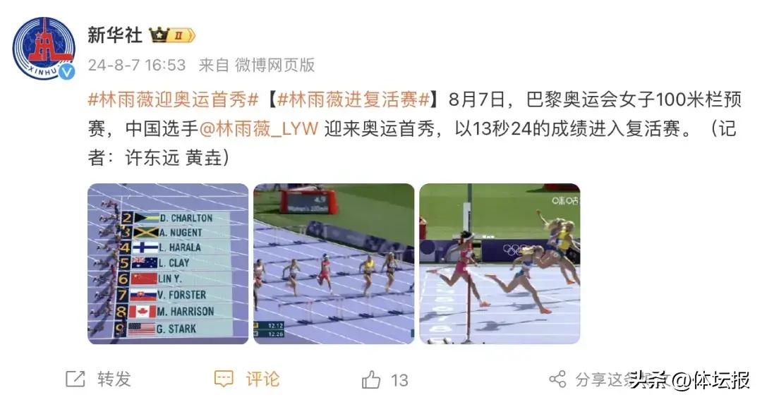 當地時間8月7日,巴黎奧運會田徑女子100米欄舉行首輪比賽,中國選手吳豔妮以12秒97(小組排名第6)、林雨薇以13秒24 (小組排名第7)完成各自的奧運首秀,根據本次賽事規則,她們將進入復活賽,再次爭取晉級資格。