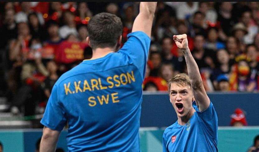 第一場男雙比賽中,中國隊派出馬龍搭檔王楚欽,而對手則是用卡爾伯格與卡爾松的組合,雙方打得難解難分,一路膠着,瑞典組合率先拿下首局,隨後馬龍與王楚欽連贏兩局反超,但卡爾伯格與卡爾松非常頑強地在第四局率先拿到11分,最終,雙方進入殘酷決勝局,國乒組合有驚無險擊敗對手,3比2獲得第一分,而瑞典組合一度氣到摔掉拍子!