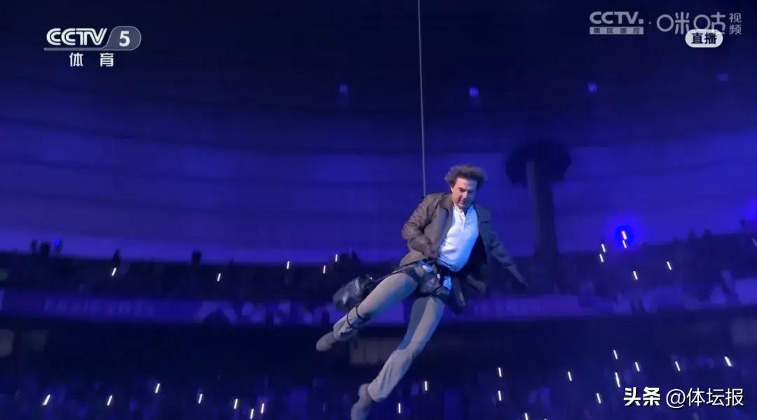 湯姆·克魯斯從法蘭西體育場42米高的屋頂速降,騎摩托車帶走奧運旗幟。隨後,現場播放一段2分鐘的影片,展示阿湯哥將旗幟帶到2028年洛杉磯奧運會,並跳傘降落在好萊塢字母標誌上,同時傳遞給不同項目的運動員。
