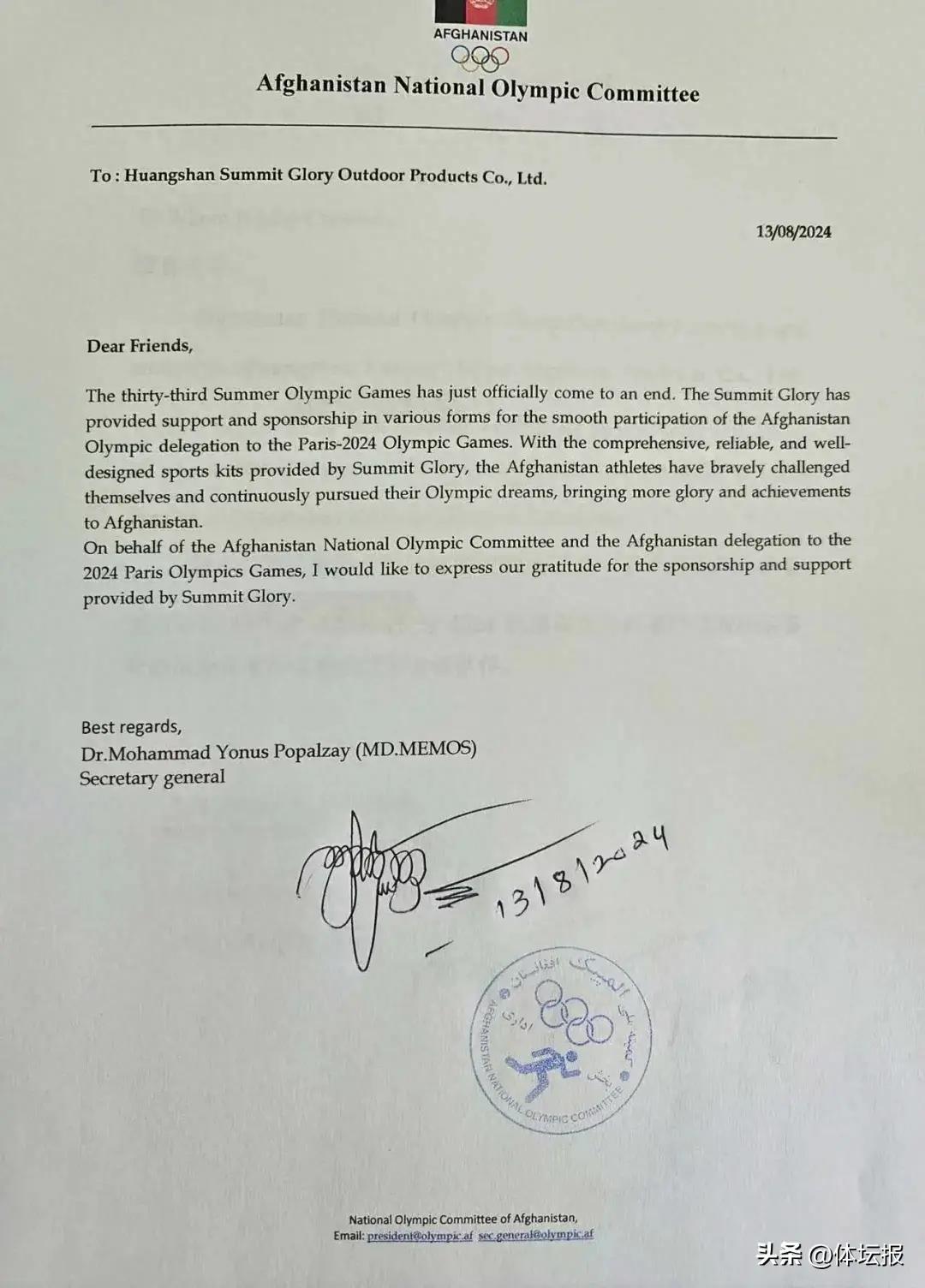 巴黎奧運會開幕式上第一個亮相的中國運動品牌,來自浙江,用“和平綠”驚豔全世界!今天,一封來自阿富汗奧委會的感謝信,千里迢迢寄到杭州錢塘江畔的一家企業,這背後是什麼故事?