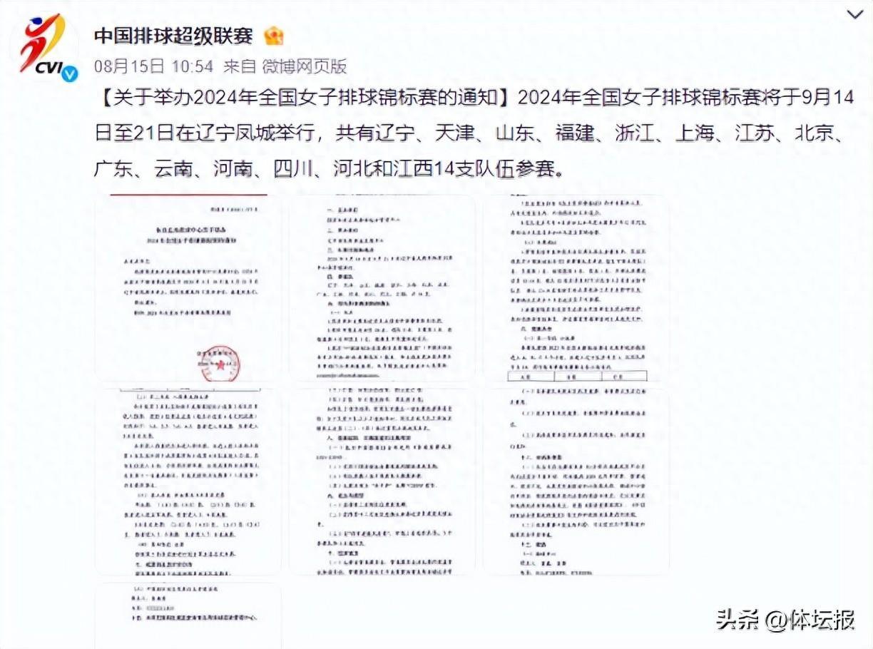 近日,中國排協正式宣佈了2024年全國女子排球錦標賽的相關信息。比賽定於9月14日至21日在遼寧鳳城舉行,將有來自全國的14支隊伍參賽。