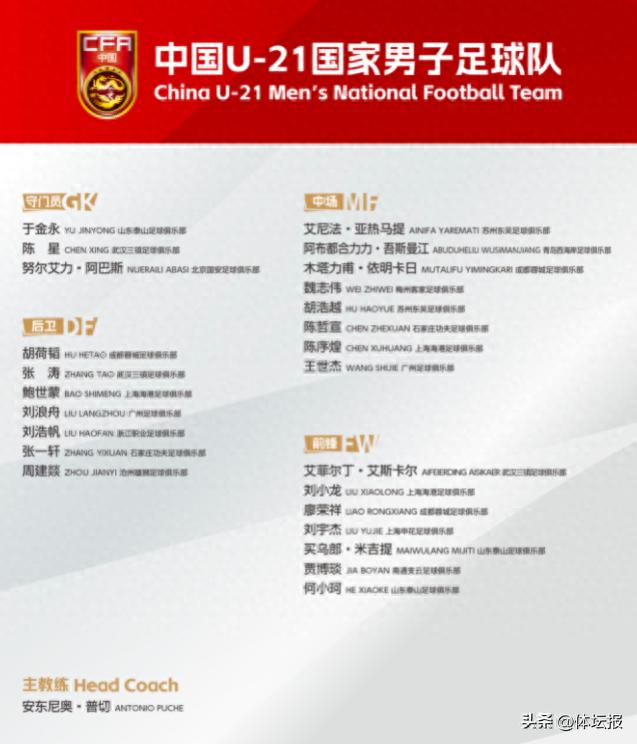 值得關注的是,除劉浩帆外,還有包括於金永、艾菲爾丁、木塔力甫、胡荷韜在內多位曾入選過國奧隊的球員悉數進入這支U21國足。但從整體來看,入選本期U21國足集訓陣容的25名球員中,有17人都未代表2003年齡段原U20國足參加去年U20亞洲盃決賽階段賽事。