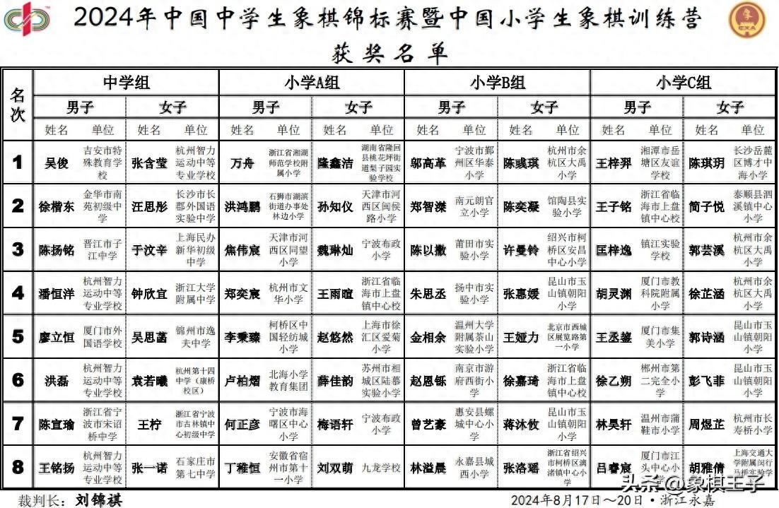 2024年全國中學生象棋錦標賽暨全國小學生象棋訓練營,按年齡,分爲中學組、小學A組、小學B組、小學C組。