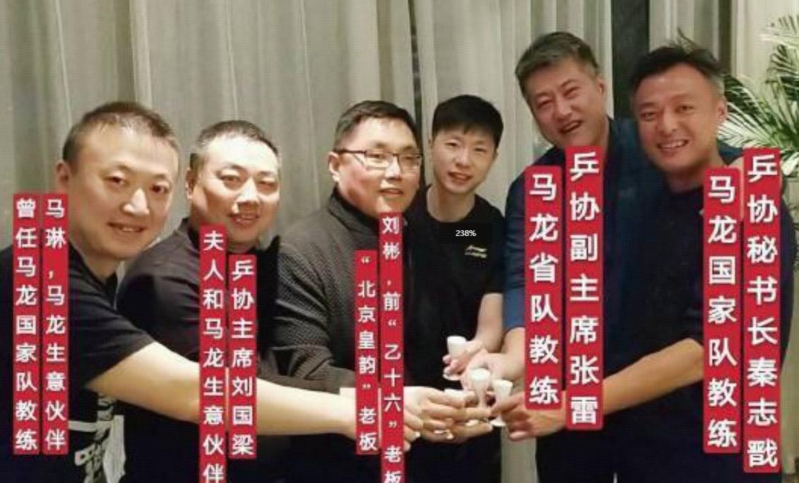 據悉,這張合影來自於“北京皇韻”,而戴眼鏡站在C位的就是劉彬,“乙十六”老闆,國乒多次活動都在他開的酒店舉行,他甚至還和劉國樑的妻子合夥做生意,馬龍好像也有參與,所以才與之私交甚密,對此,不少網友猜測,這場冠軍飯局應該是“龍隊”帶的頭,用自己的人脈關係才找到了這麼多體育明星參加。
