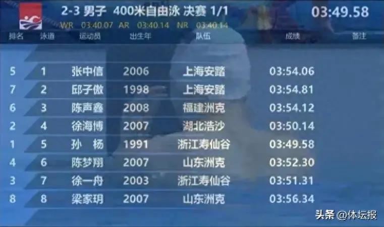 當晚最引人矚目的便是男子400米自由泳決賽。孫楊解禁復出後重返賽場,在與一羣“00後”、甚至“10後”的競爭中,孫楊以3分49秒58獲得金牌!浙江小將徐一舟獲得銅牌。