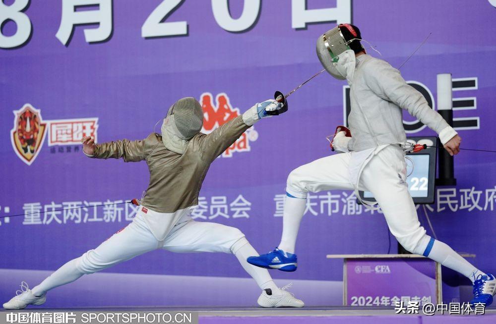 中國體育訊 8月25日,2024全國擊劍冠軍賽總決賽在重慶國際博覽中心舉行。在男子佩劍團體決賽中江蘇隊戰勝廣東隊獲得冠軍。圖爲比賽場景。(中國體育圖片 倪敏哲 攝)