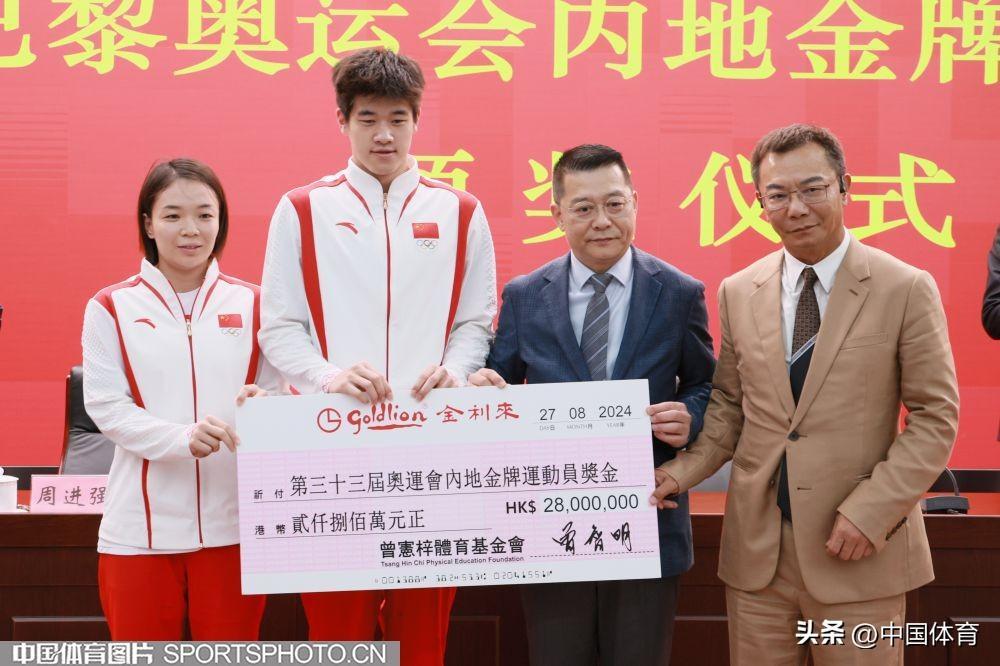 中國體育訊 今日下午(8月27日),曾憲梓體育基金會巴黎奧運會內地金牌運動員頒獎儀式於8月27日下午在京舉行。曾憲梓體育基金會理事長曾智明、副理事長曾智雄向巴黎奧運會內地金牌運動員頒發了獎金支票,獎金總額爲港幣2800萬元。國家體育總局局長高志丹、副局長周進強以及巴黎奧運會金牌運動員代表出席了頒獎儀式。(中國體育圖片 鹿麟 攝)