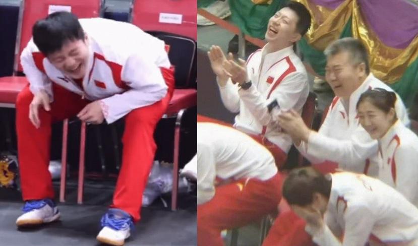 特別是樊振東,他在場邊看着盛李豪的一舉一動,簡直快笑暈了,一度雙腳離地笑成一團,身旁一向嚴肅的國乒教練李隼也樂了,還有馬龍、陳夢和王曼昱,看到盛李豪笨拙又努力的動作時,全都破防了,笑到抬不起頭。