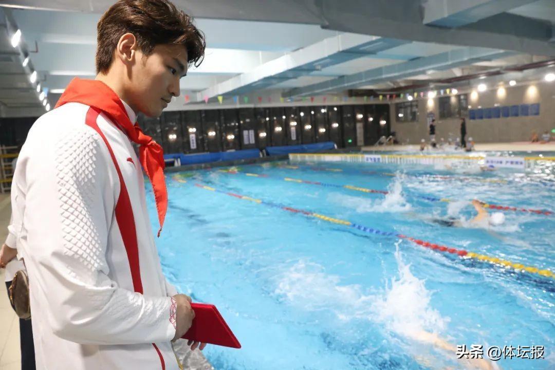 徐嘉餘來到學校游泳館,觀摩、指導校隊的訓練,細心地幫助小隊員糾正游泳動作。
