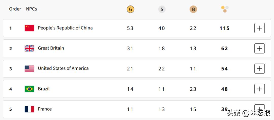 目前,巴黎殘奧會賽程已過半,中國代表團繼續高歌猛進,已收穫53金40銀22銅,依舊高居獎牌榜首位。英國隊緊隨其後,有31金入賬;美國隊以21金排在第三。