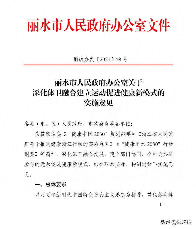 爲貫徹落實《“健康中國 2030”規劃綱要》《浙江省人民政府關於推進健康浙江行動的實施意見》《“健康麗水 2030”行動綱要》等精神,深化體衛融合發展,建立部門協同、全社會共同參與的運動促進健康新模式,麗水市政府3日出臺《關於深化體衛融合建立運動促進健康新模式的實施意見》(以下簡稱《意見》)。