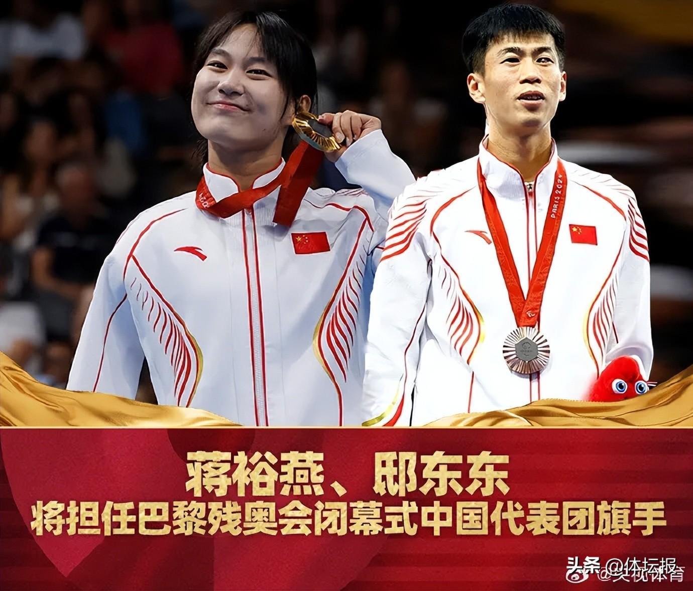 9月7日,據央視網報道,中國殘奧代表團閉幕式旗手定了——將由我省游泳運動員蔣裕燕,以及田徑運動員邸東東擔任!