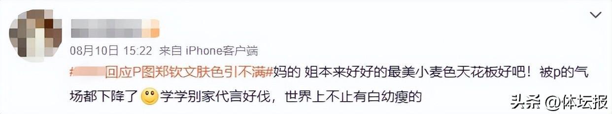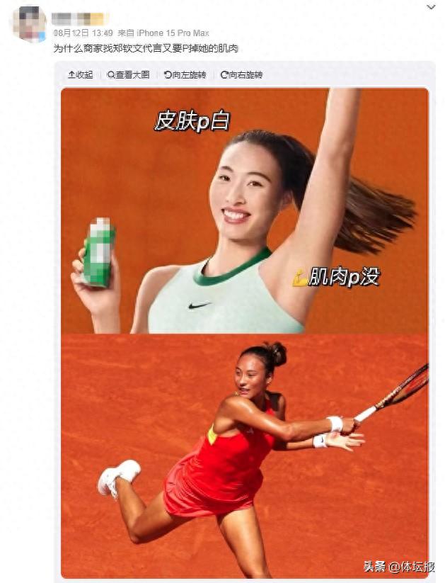 在某品牌的代言中,鄭欽文的小麥色皮膚變成“奶油白皮膚”,肌肉線條“被P沒了”。