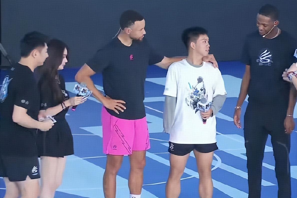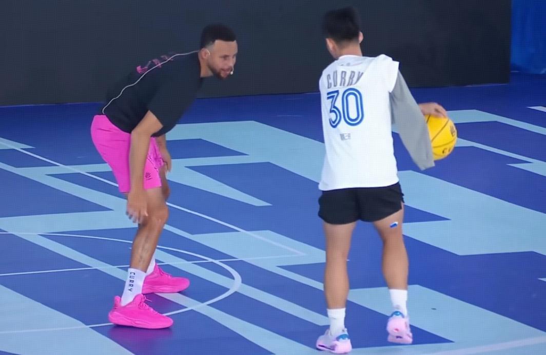 隨後,庫裏與張家城進行了1V1單挑,第一球命中的時候,庫裏主動示意自己踩線了,遠投只能算1分,又給了孩子一個進攻機會,張家城完成高難度上籃得分,非常漂亮,庫裏也與之擊拳慶祝。最終,庫裏還是上演一次標誌性遠投,終結比賽,雖然輸給了庫裏,但相信張家城的內心是無比沸騰和感動的。