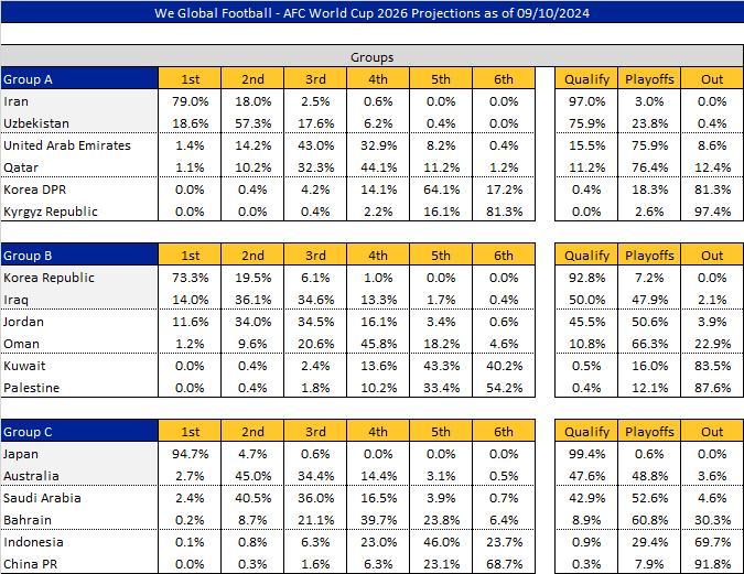 國足0比7輸給日本,然後又在主場,1比2被沙特隊絕殺,兩場比賽下來,我們小組墊底,尷尬0分,最關鍵的是,中國隊的淨勝球數達到了負8個,這樣的情況下,幾乎沒有人會認爲國足有衝擊世界盃的可能性,按照18強賽的賽程規則,每組前二可以直接出線,外媒評估了現階段所有球隊的晉級可能性,其中,國足的出線概率進位0.3%!