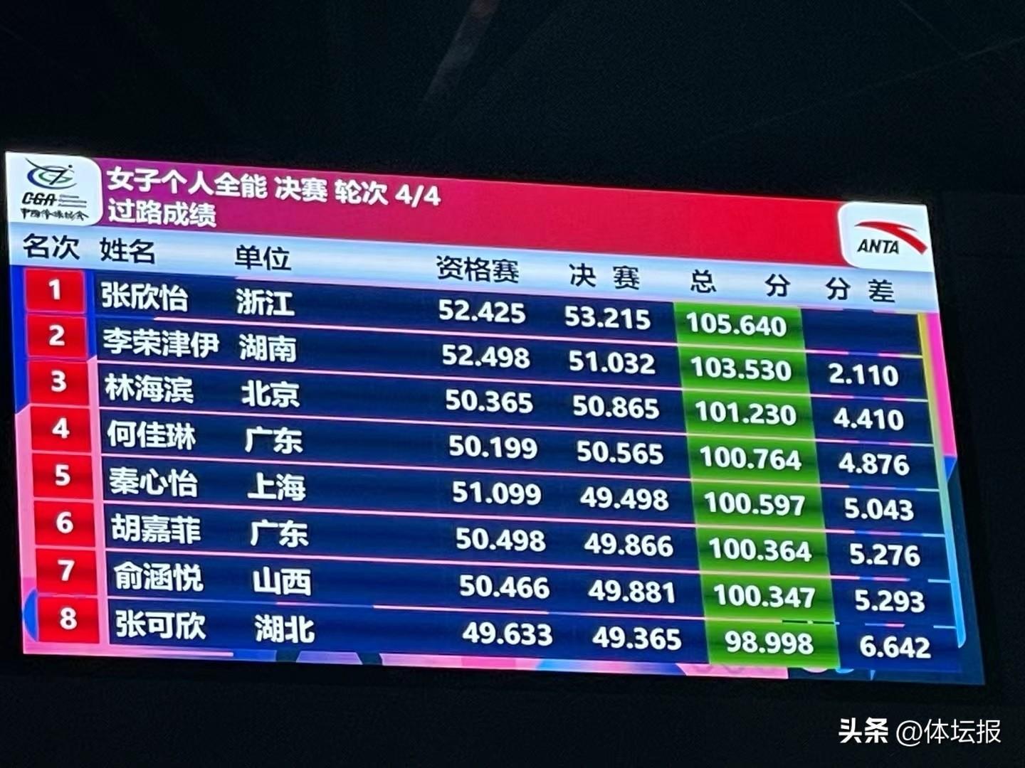 資格賽排名第二的張欣怡在18日舉行的全能決賽展現出較強的競爭力,在高低槓、自由體操項目排名全場第一,跳馬、平衡木得分排名全場第二的成績獲得冠軍;湖南隊的李榮津伊、北京隊的林海濱分獲亞軍和季軍。