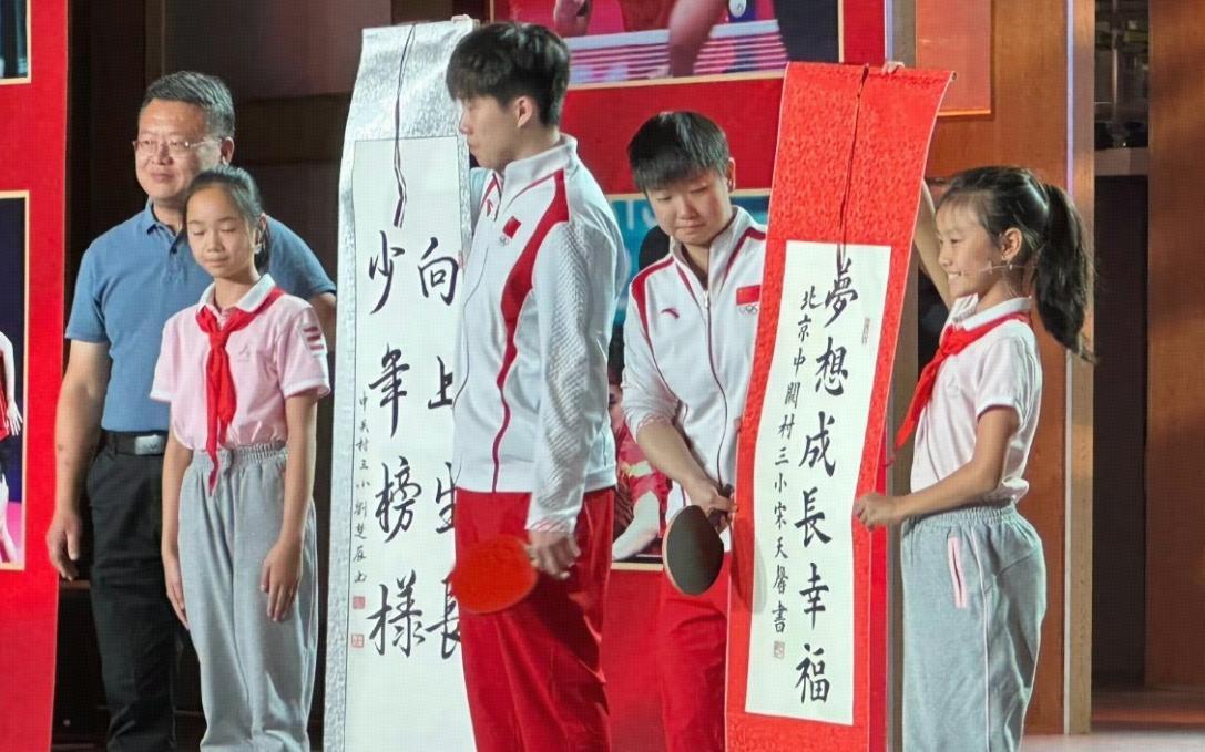 莎頭組合重聚!與小學生們見面,臺上對打乒乓球,孫穎莎送寄語