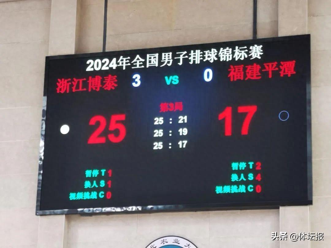 9月29日,2024年全國男排錦標賽在保定市河北農業大學(西校區)體育館落幕。浙江博泰男排在5、6決賽中,以3:0戰勝福建平潭男排,收穫第五名。