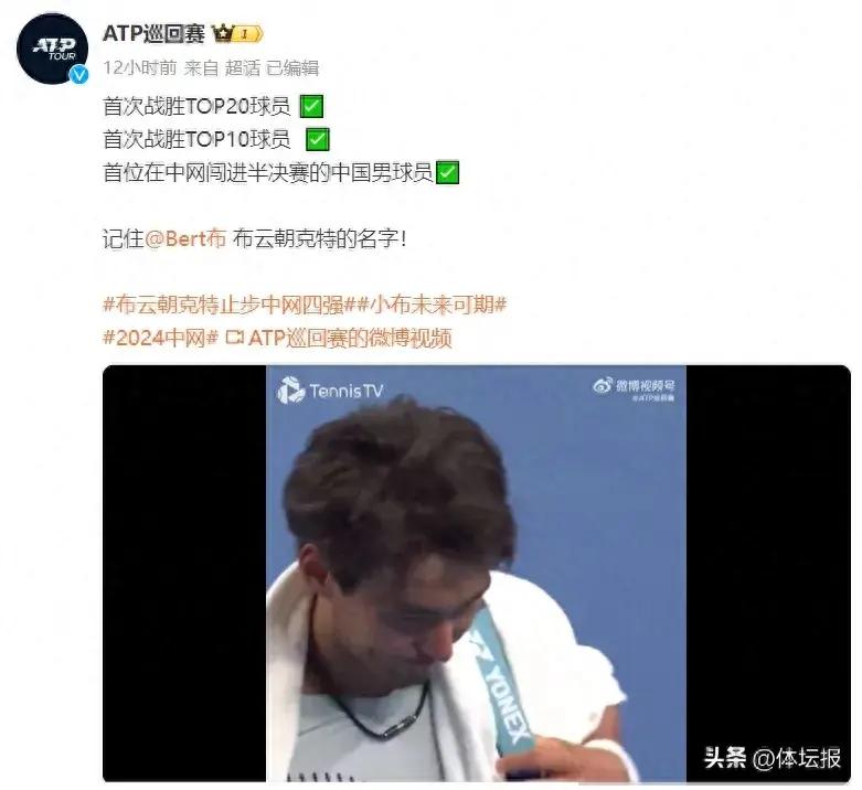 10月1日,2024中國網球公開賽進入男單半決賽,近期狀態火熱的浙江選手布雲朝克特苦戰2小時4分鐘,以3-6、6-7(3)負於賽事衛冕冠軍、世界排名第一的意大利選手辛納,無緣決賽。雖然如此,屢屢取得突破的小布仍創造了中網協男子選手的中網最好成績。